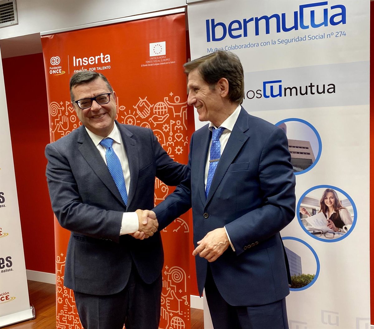 El director general de Fundación ONCE, José Luis Martínez Donoso, y el director general de Ibermutua, Heraclio Corrales Romeo, han firmado en Madrid un Convenio Inserta para fomentar el empleo de personas con discapacidad.