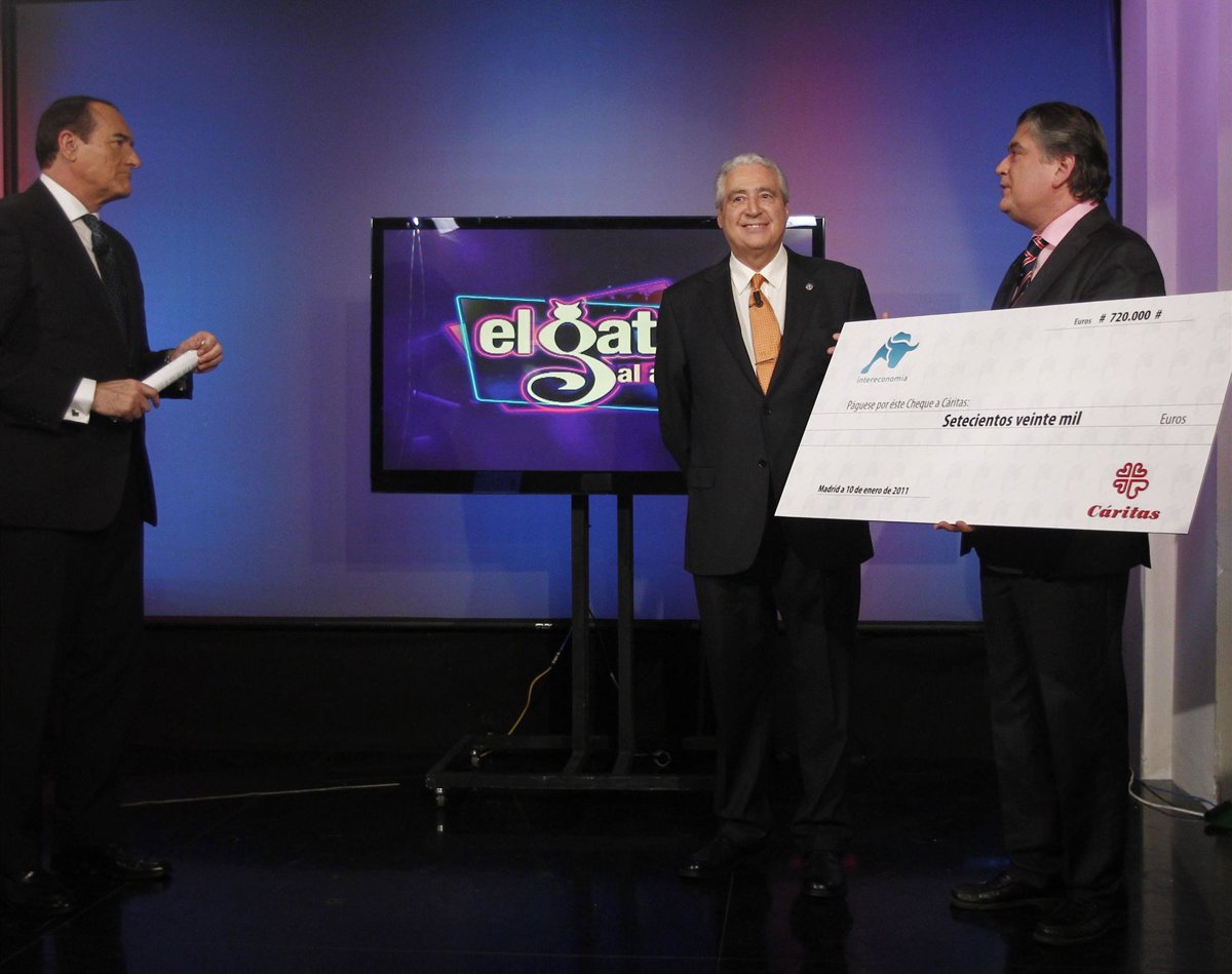 Por su parte, el director general editorial del Grupo Intereconomía, Xavier Horcajo, en presencia del director de 'El Gato al Agua', Antonio Jiménez, fue el encargado de entregar el cheque al presidente de Cáritas España, Rafael del Río.