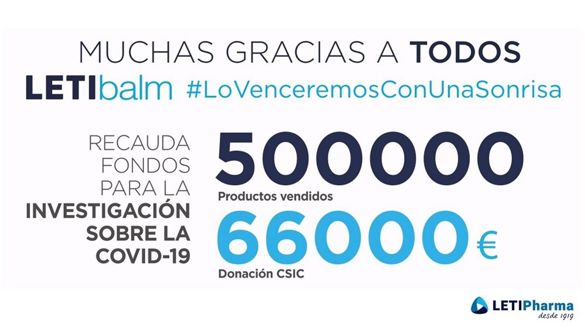 La compañía LETI Pharma ha conseguido recaudar más de 66.000 euros, gracias a las ventas de la gama LETIbalm dentro de la campaña solidaria #LoVenceremosConUnaSonrisa, que se han donado al Consejo Superior de Investigaciones Científicas (CSIC) para su investigación científica contra la COVID-19.
