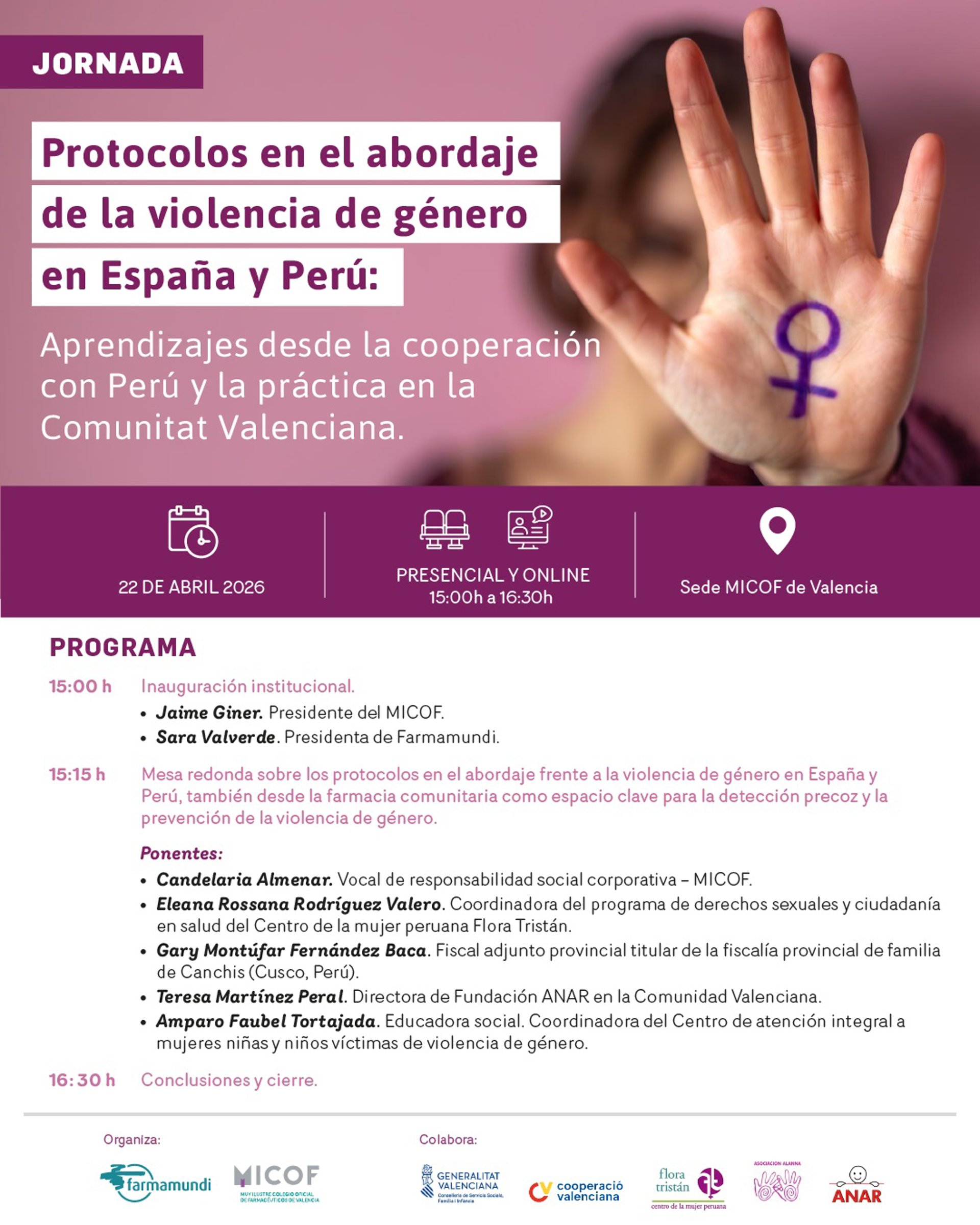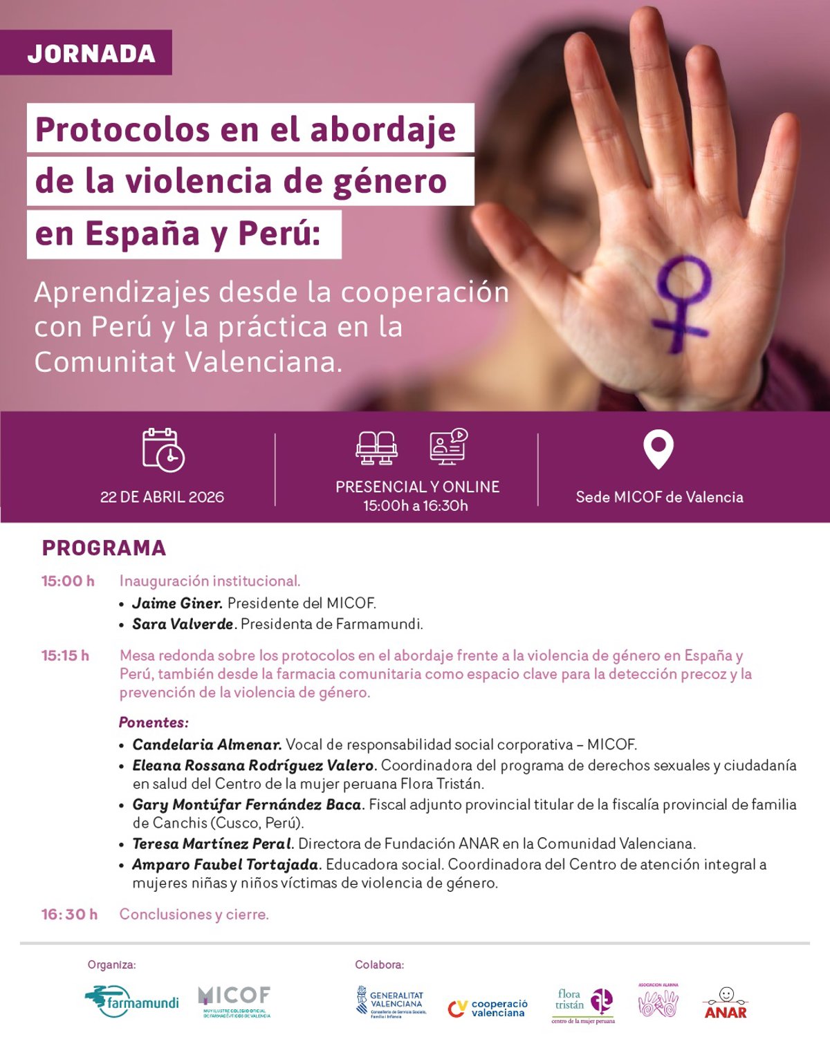 El Muy Ilustre Colegio Oficial de Farmacéuticos de Valencia (Micof) acogerá, el próximo miércoles 22 de abril, un encuentro informativo organizado junto a Farmamundi que reunirá a profesionales de España y Perú --de entidades como Flora Tristán, Fundación ANAR o Asociación Alanna-- para compartir experiencias, protocolos y buenas prácticas en la prevención y abordaje de la violencia de género, con especial atención al papel de la farmacia comunitaria.