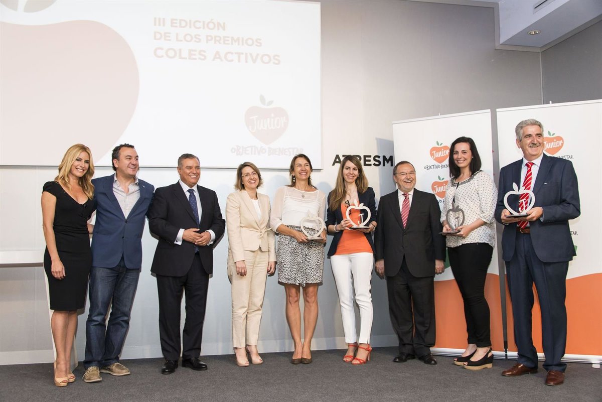 'Objetivo Bienestar Junior' ha entregado este martes en la sede principal de Atresmedia sus premios 'Coles activos', que este año celebran su III edición, al Colegio Maestro Manuel Aparcero de Chipiona (Cádiz), al Colegio Internacional Kolbe de Villanueva de la Cañada (Madrid), al Centro San Gregorio-Nuestra Señora de la Compasión de Aguilar de Campoo (Palencia) y al Colegio Madres Concepcionistas (Madrid).