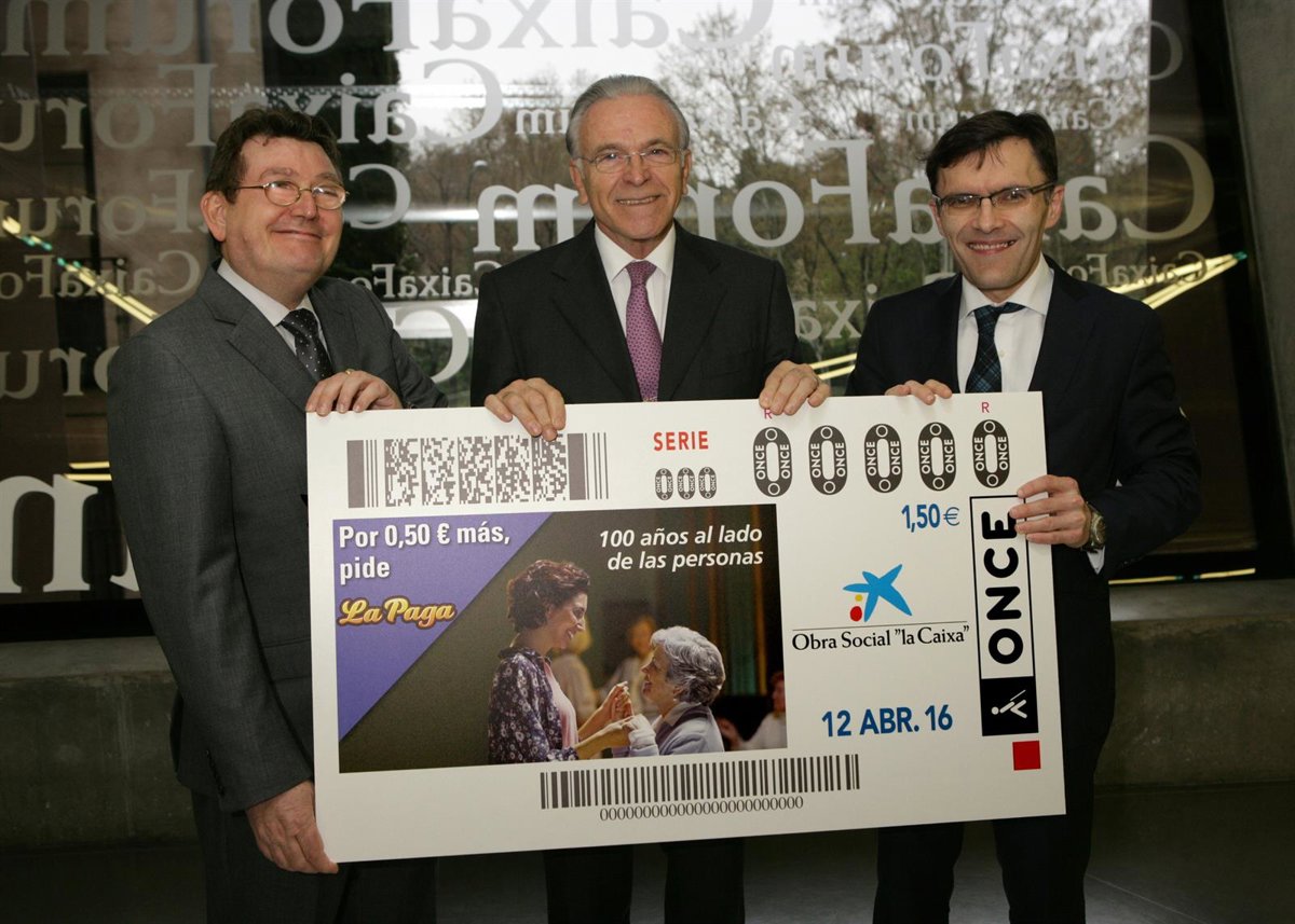 Así lo han dado a conocer el presidente de la Fundación Bancaria 'la Caixa', Isidro Fainé, el director general de la ONCE, Ángel Sánchez, y el vicepresidente ejecutivo de la Fundación ONCE, Alberto Durán, quienes han presentado este cupón dedicado a los 100 años de compromiso de la Obra Social 'la Caixa'.