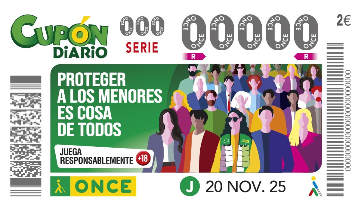 La ONCE dedica su cupón de este jueves, 20 de noviembre, al juego responsable. Cinco millones de cupones advertirán que 'Proteger a los menores es cosa de todos'.