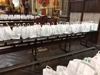Bolsas con comida para repartir entre personas vulnerables en la Iglesia de San Antón. - MENSAJEROS DE LA PAZ