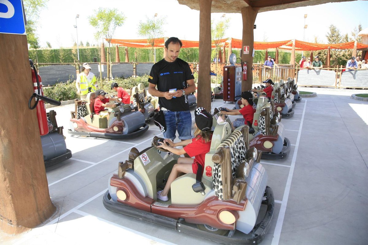 El encuentro ha tenido lugar en una de las nuevas atracciones de Parque Warner: 'La Escuela de Conducción', un circuito infantil que recrea la escenografía de Los Picapiedra y en la que el piloto de ha enseñado a doce niños de entre 7 y 10 años las normas básicas de conducción y circulación en un circuito.