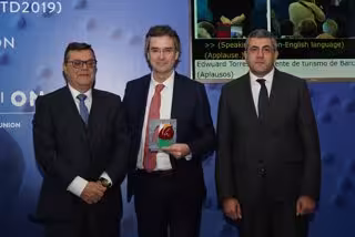 El presidente del Comité Ejecutivo de Turisme de Barcelona, Eduard Torres, con el premio obtenido - FUNDACIÓN ONCE