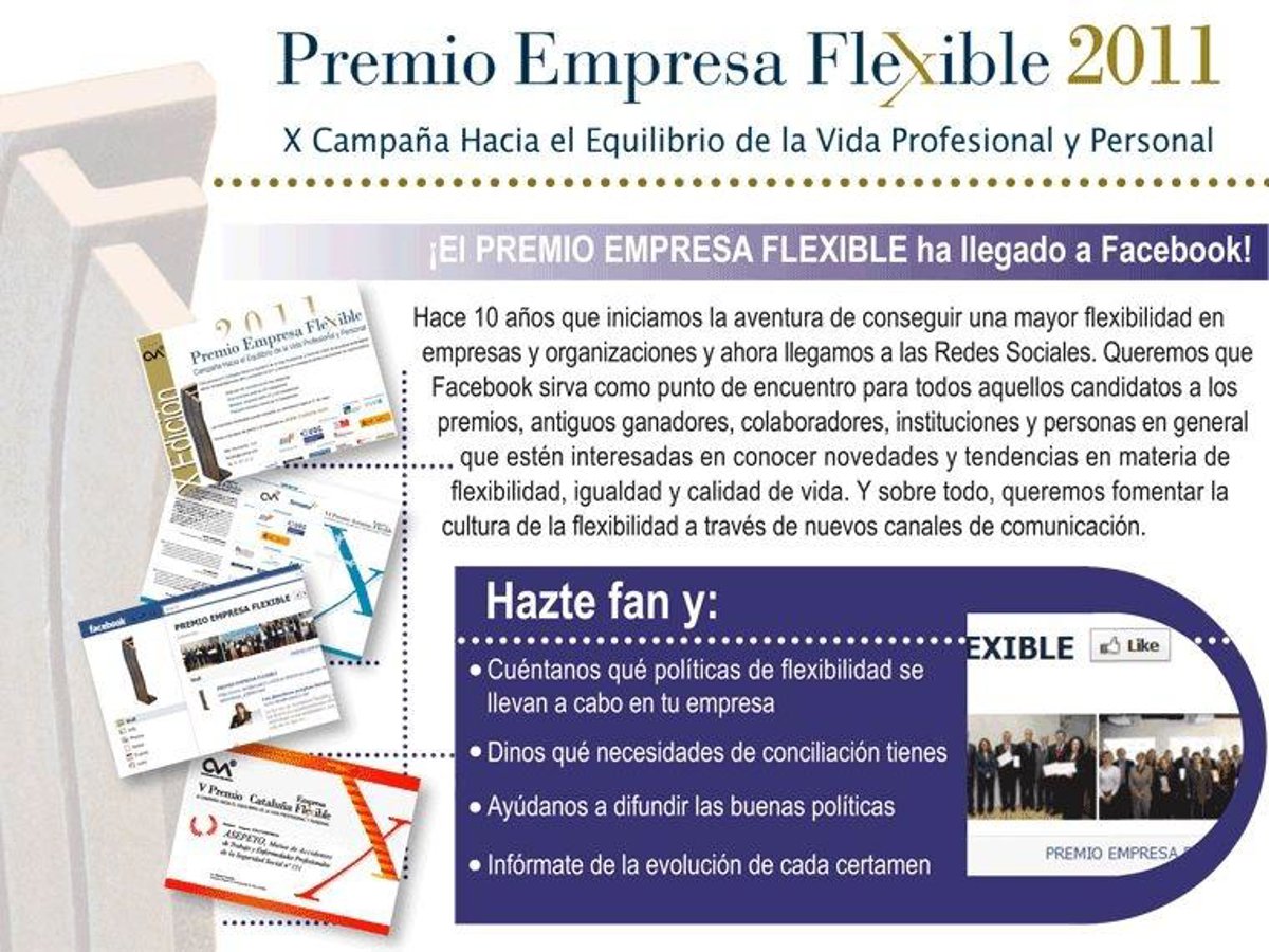 La agencia de comunicación CVA ha puesto en marcha, por décimo año consecutivo, la X Edición del Premio Empresa Flexible, una campaña orientada a difundir las medidas de conciliación que las compañías españolas ofrecen a sus trabajadores y que también se puede seguir en las redes sociales, ya que cuenta con página en Facebook.