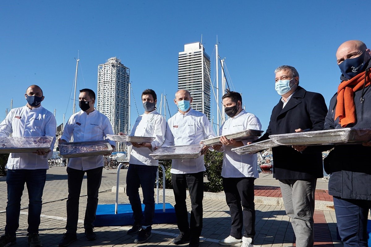 Junto a los cocineros, han participado en el acto el director del Port Olímpic, Toni Roig; el presidente de Provacuno, Eliseo Isla Argelich, y el primer teniente de alcaldía de Barcelona, Jaume Collboni, que ha agradecido la acción.