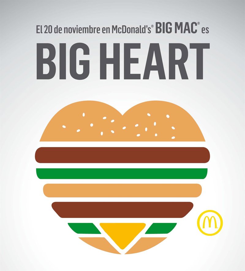 McDonald's España va a celebrar en todos sus restaurantes este 20 de noviembre, con motivo del Día Mundial del Niño, la iniciativa solidaria 'Big Mac, Big Heart' en la que todo lo que se recaude ese día por la venta del 'Big Mac', ya sea en menú o individual, se destinará a la Fundación Infantil Ronald McDonald, que se ocupa de la construcción y mantenimiento de las Casas Ronald McDonald para alojar familias con niños que reciben tratamiento hospitalario de larga duración.