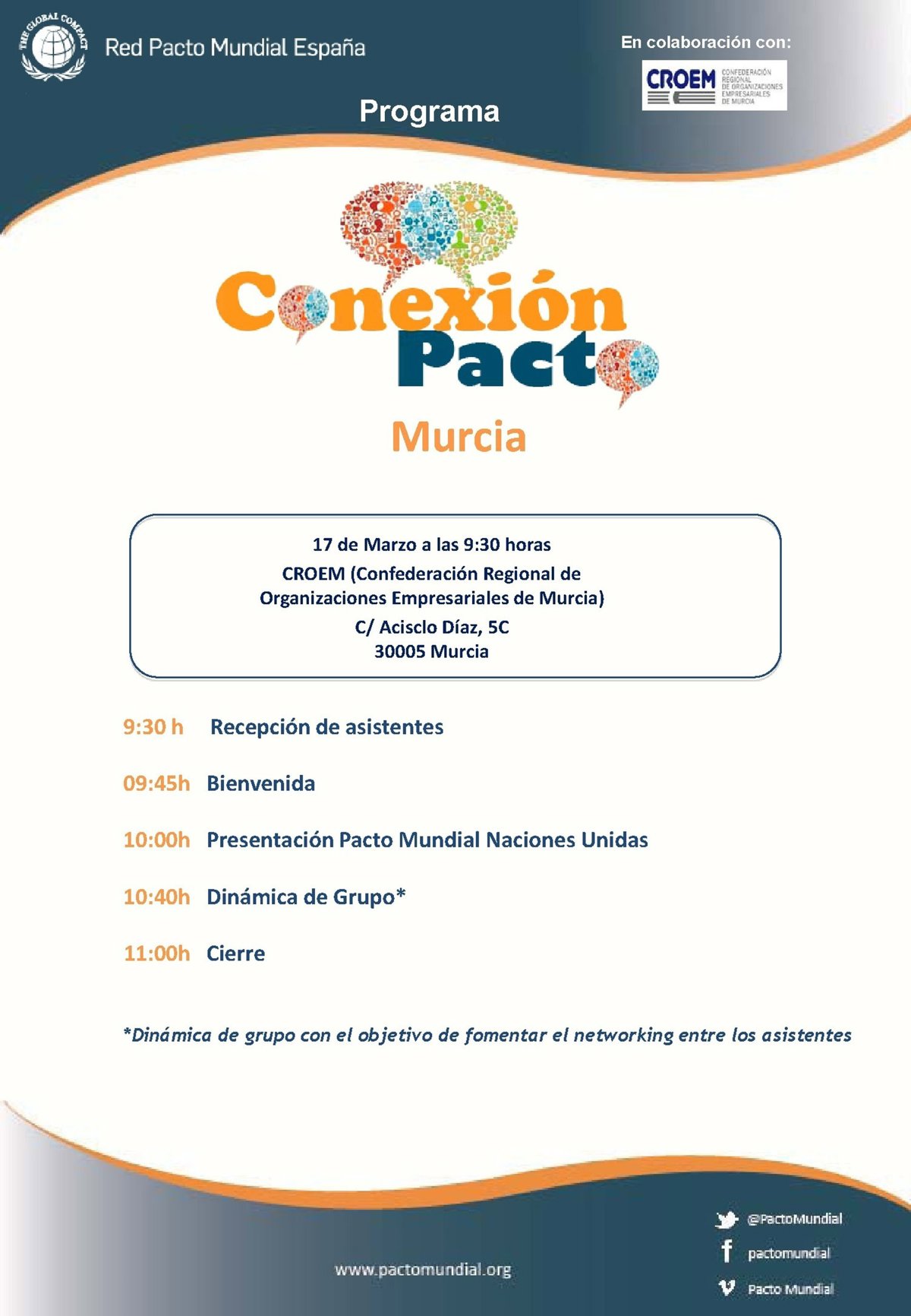 La jornada comenzará a las 9.45 horas e incluirá una presentación del Pacto Mundial de las Naciones Unidas por la Responsabilidad Social, así como una dinámica de grupo que permita el 'networking' entre los asistentes.
