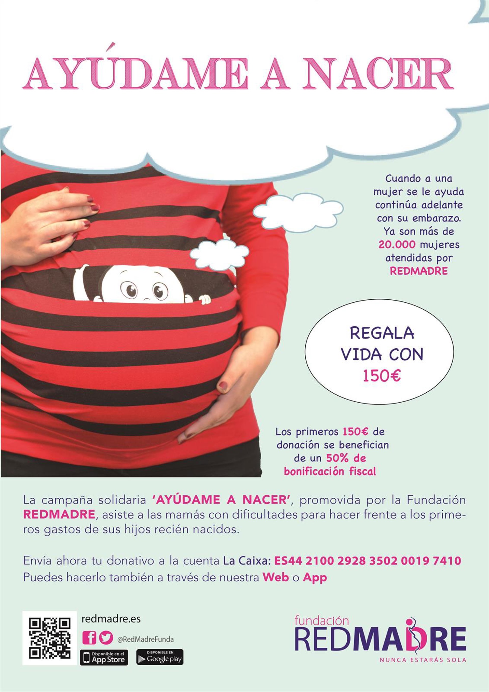La Fundación Redmadre ha lanzado la campaña solidaria 'Ayúdame a nacer', cuyo objetivo es atender a las más de 10.000 mujeres que necesitan ayuda a la hora de hacer frente a los primeros gastos de sus hijos recién nacidos y llevar a término su embarazo en circunstancias más favorables, según ha informado la entidad.