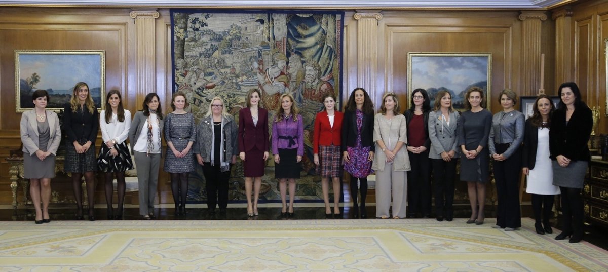 La Reina Letizia ha recibido este martes en el Palacio de la Zarzuela a la junta directiva de la Asociación Española de Ejecutivas y Consejeras, una organización que tiene como objetivos fundamentales la promoción y la presencia de las mujeres en los puestos de alta dirección y consejos de administración.