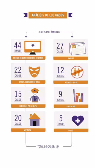 En concreto, en 2014 se registraron 194 casos de los que 45 eran individuales y 149 colectivos. Afectaron a más de 382 personas de las que 203 eran hombres y 179, mujeres (en 23 casos las víctimas no se han determinado). Se dieron principalmente en medios de comunicación e Internet (77), con expresiones de odio (28), en el acceso al empleo (26), en el acceso a bienes (17) y en la relación con las fuerzas policiales (17).