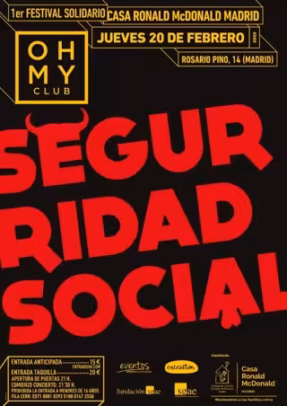 La banda de rock Seguridad Social y la Fundación Infantil Ronadl McDonald se han unido para impulsar un festival solidario en la sala 'OH My Club' de Madrid, cuyos beneficios se destinarán íntegramente al mantenimiento de la casa que la Fundación tiene en Madrid.