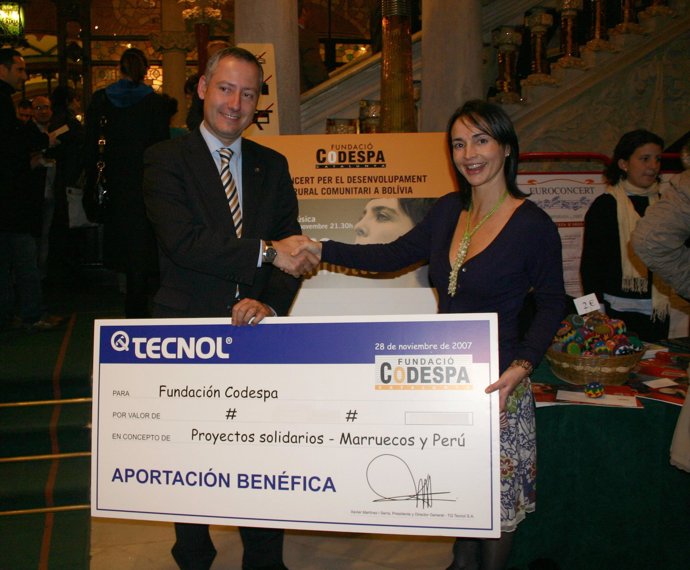 El pasado 28 de noviembre, con motivo del Concierto Benéfico Anual que la Fundación Codespa celebró en el Palau de la Música de Cataluña, Tecnol hizo entrega de un cheque simbólico gracias al cual la ONG financiará dos proyectos educativos en Perú y Marruecos.
