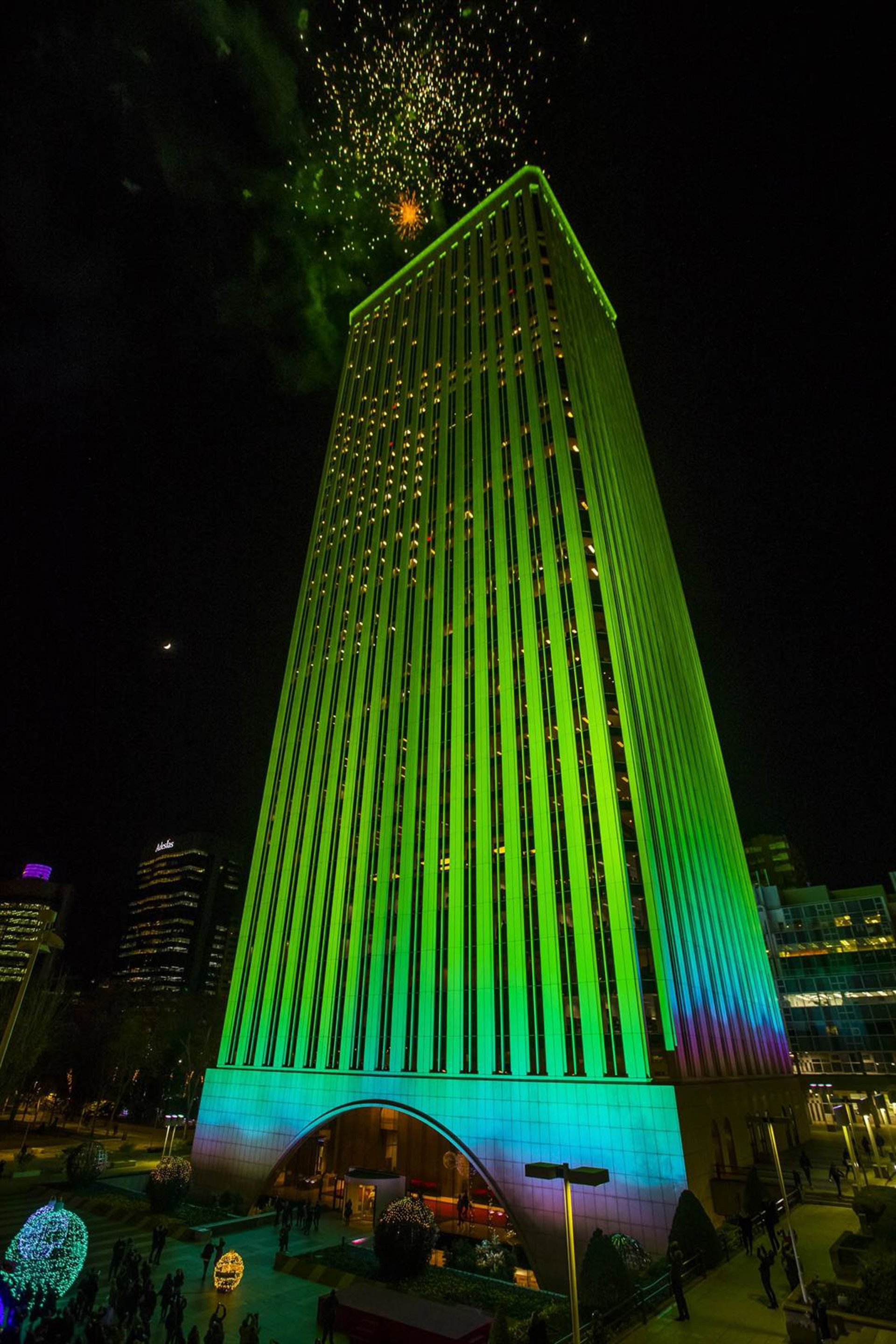 Como si de un árbol gigante de Navidad se tratara, la Torre se ha teñido de luz verde junto a grandes esferas de luz y un sinfín de formas tejidas por pequeñas bombillas que iluminarán el corazón del complejo financiero de Azca durante toda la temporada navideña.