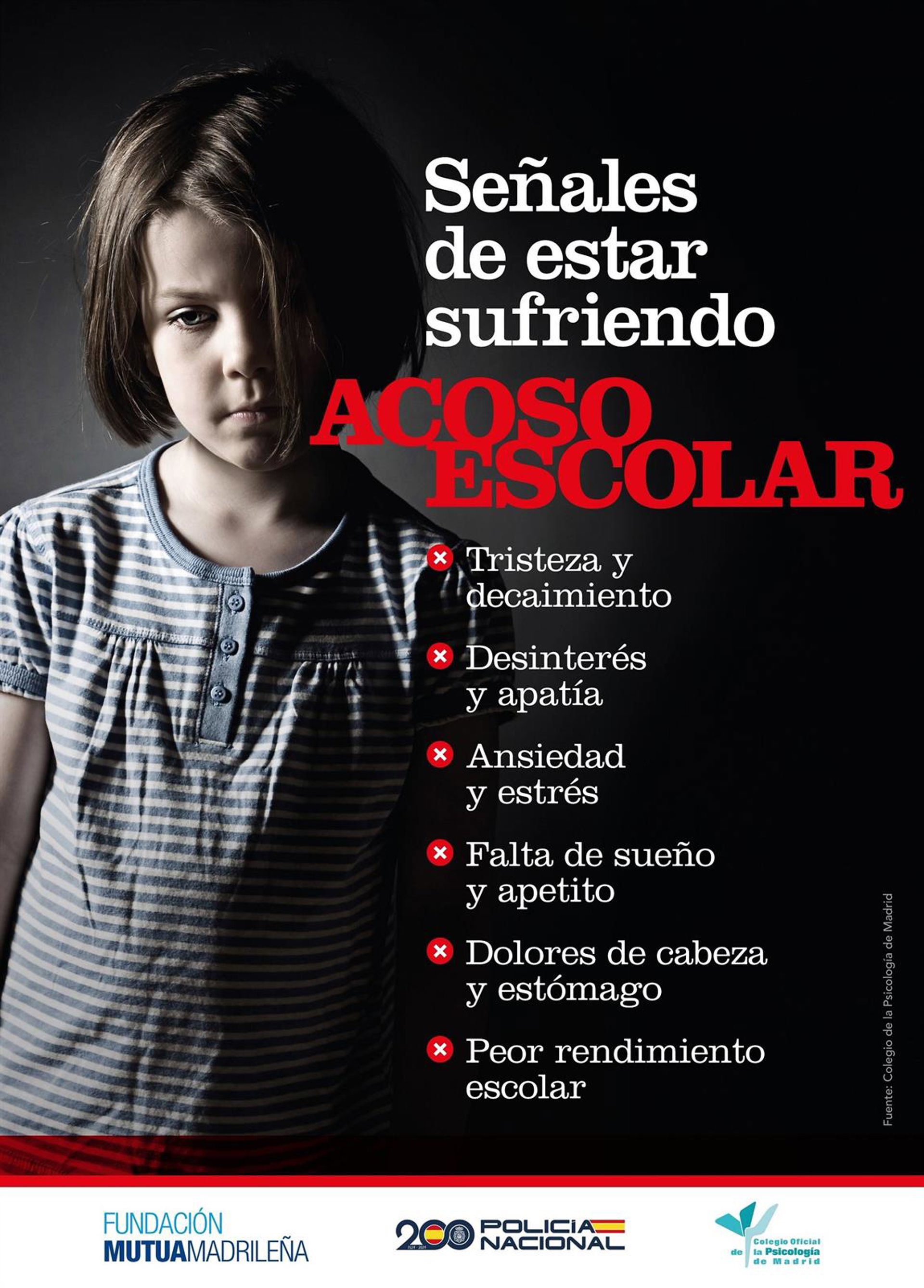 La Fundación Mutua Madrileña, en colaboración con el Colegio Oficial de la Psicología de Madrid y la Policía Nacional, ha identificado los signos y síntomas que pueden aparecer en un niño que está sufriendo bullying.