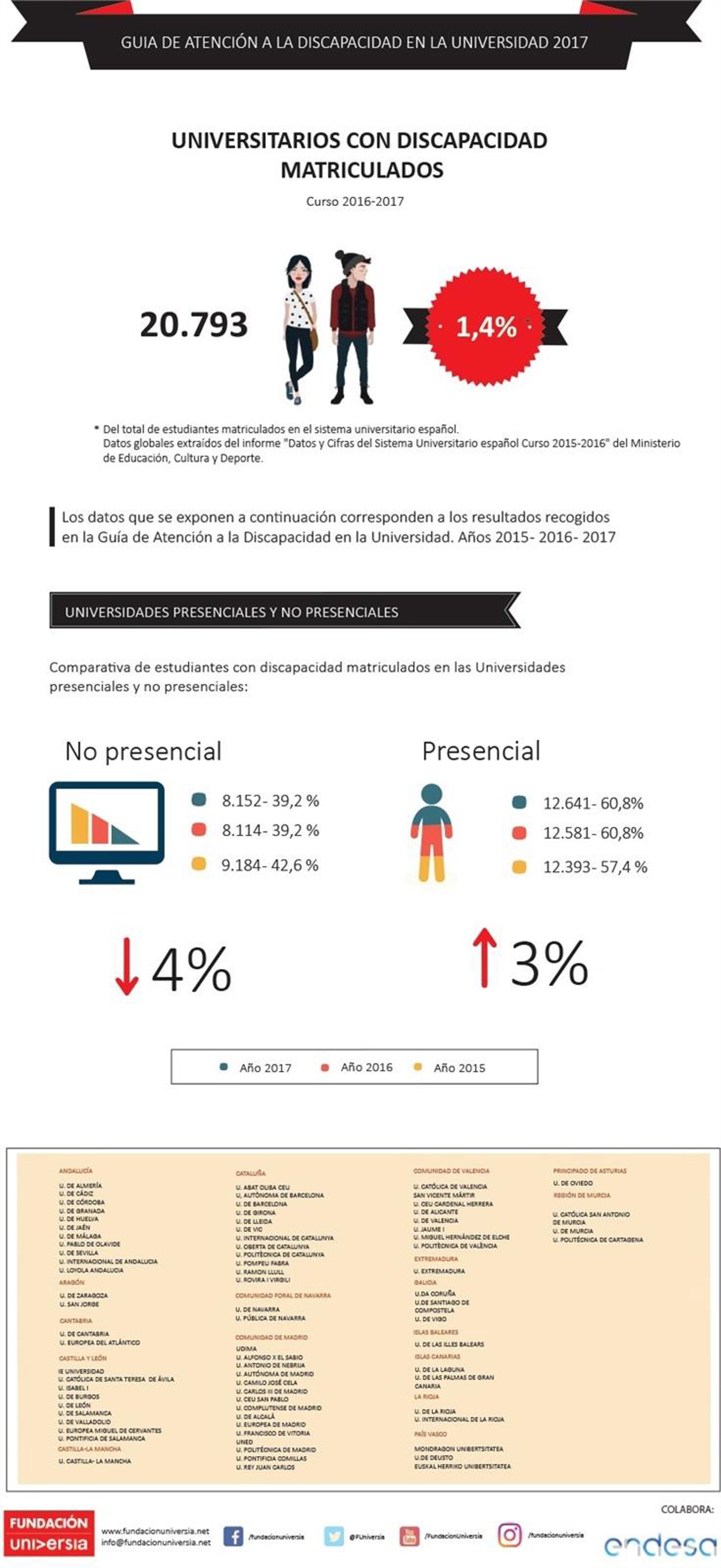Fundación Universia y Endesa han publicado la décima edición de la guía para informar a de lo que las universidades ofrecen en materia de atención a los alumnos con discapacidad, que han aumentado ligeramente en el último curso escolar (1,4%), hasta los 20.793 alumnos tras dos años de bajada.