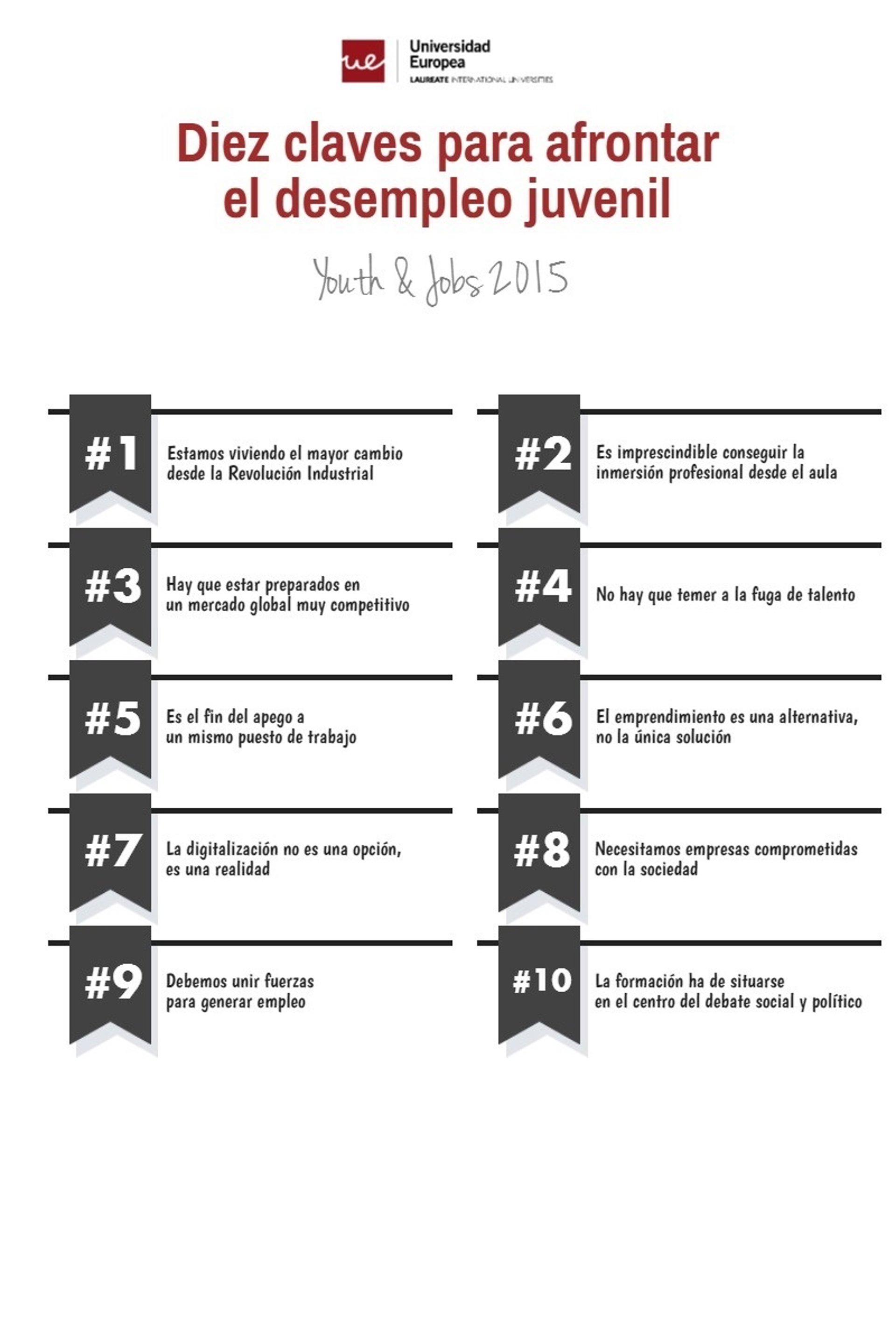 Representantes del mundo de la educación, de la empresa y de instituciones han debatido sobre la "trascendencia de la formación y el papel de la universidad para mejorar los índices de empleabilidad" y han aportado una serie de claves para afrontar el desempleo juvenil, durante la cumbre 'Youth&Jobs 2015' organizada por la Universidad Europea (UE).