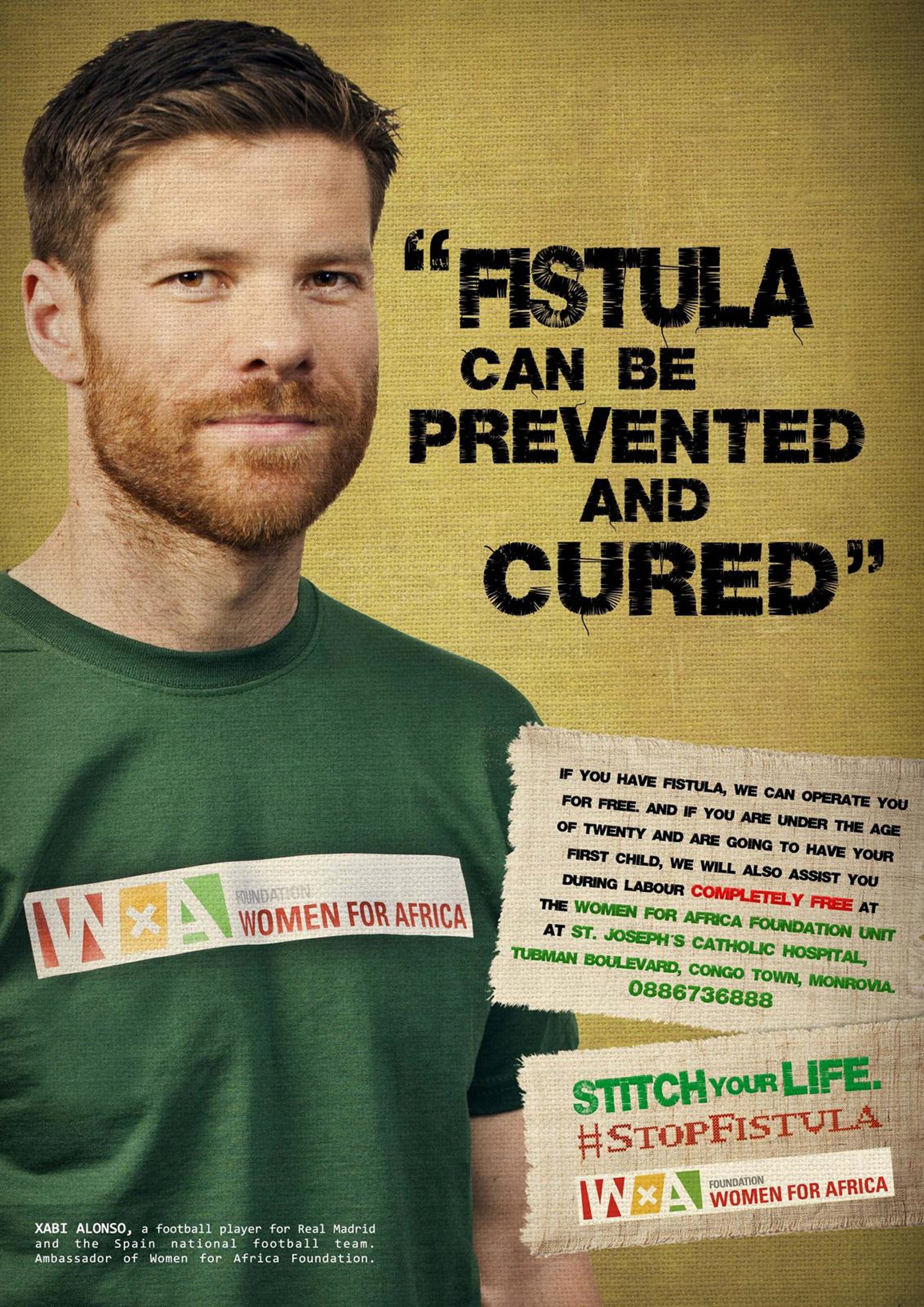 El futbolista Xabi Alonso ha apadrinado el proyecto 'Stop Fístula' puesto en marcha, el pasado 22 de abril, por la Fundación Mujeres por África para ayudar a curar y prevenir la fístula obstétrica en el continente, donde afecta a más de dos millones de mujeres, y que ya ha realizado 16 cirugías reparadoras y se han asistido ocho partos de riesgo.