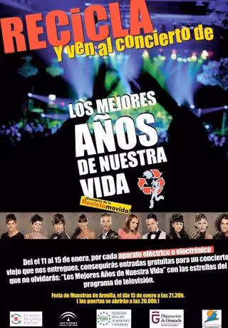 Todos aquellos interesados en asistir, debían cambiar electrodomésticos usados por las entradas para el concierto. Sólo en la provincia de Granada se han reciclado un total de 589.000 kilos de gran aparato electrodoméstico --como lavadoras, frigoríficos o lavavajillas--, más de medio millón de kilogramos de televisores y monitores de ordenador, y cerca de 400.000 kilos de otros pequeños electrodomésticos, como planchas, teléfonos o relojes, entre otros.