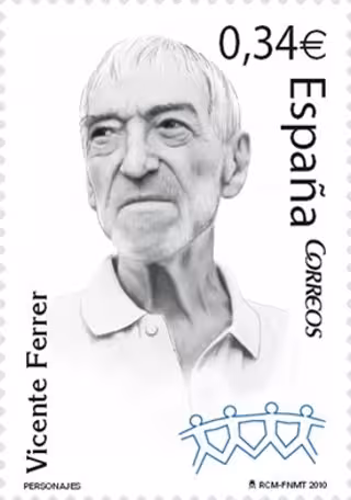 Correos ha dedicado un sello a Vicente Ferrer, fundador de la fundación que lleva su nombre, como parte de la serie filatélica 'Personajes', que tiene el objetivo de homenajear a "relevantes figuras" de la sociedad española que, en su opinión, han destacado en distintos ámbitos de la Historia.