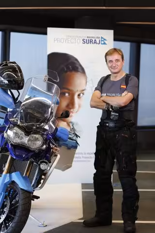 El escritor y aventurero Fabián C. Barrio partirá este sábado en moto desde Madrid rumbo a India y Nepal, en el marco de la 'Expedición Mutua Madrileña-Proyecto Suraj', una aventura solidaria que persigue combatir el problema del esclavismo infantil en los circos de la India.
