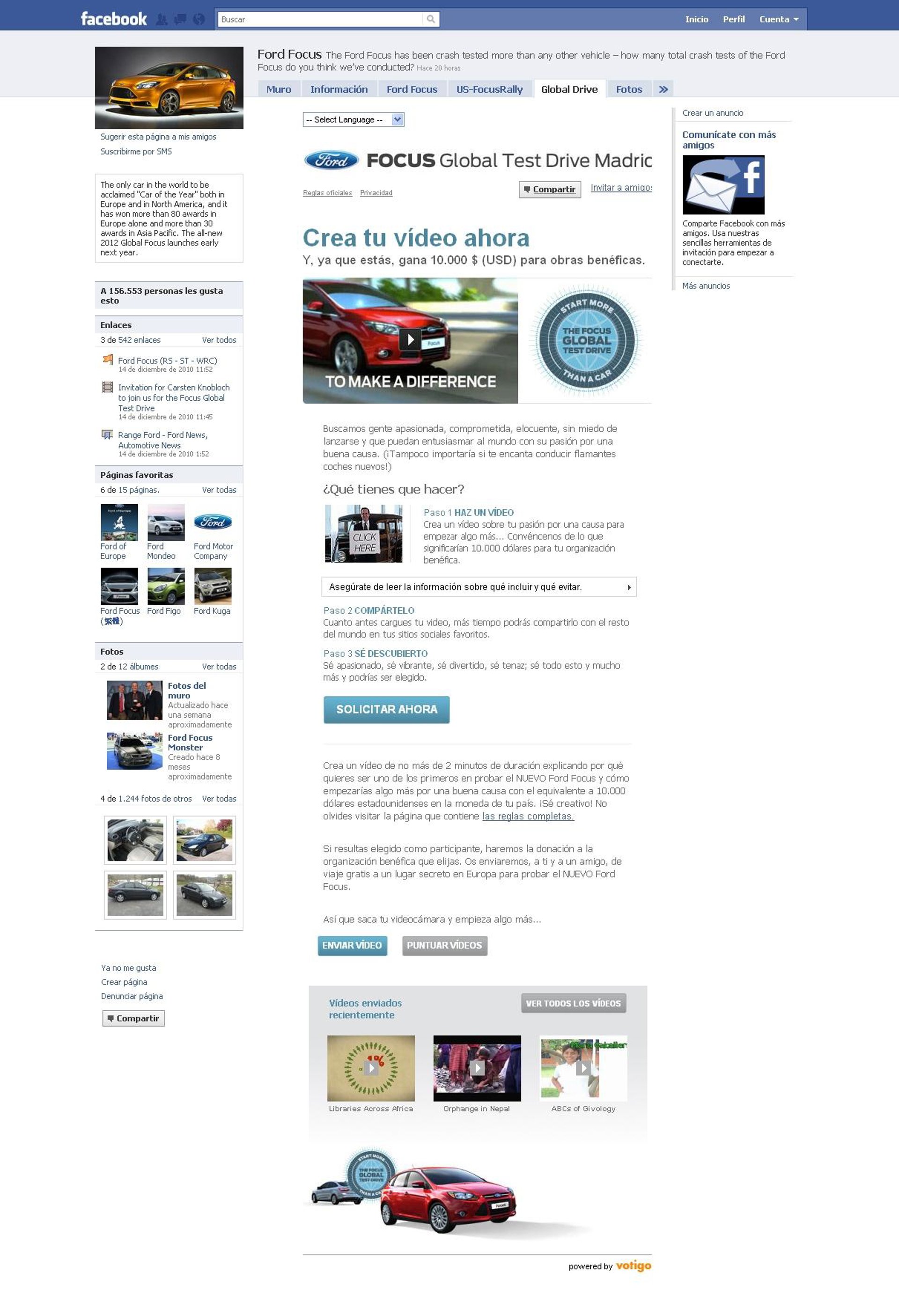 Para ello, deberán 'colgar' un vídeo en el que explicarán los motivos para ser seleccionados y cuál es la ONG a la que destinarían el donativo en caso de resultar elegidos. El vídeo se subirá a la pestaña 'Global Drive' del perfil creado para el Ford Focus en 'http://facebook.com/fordfocus'.