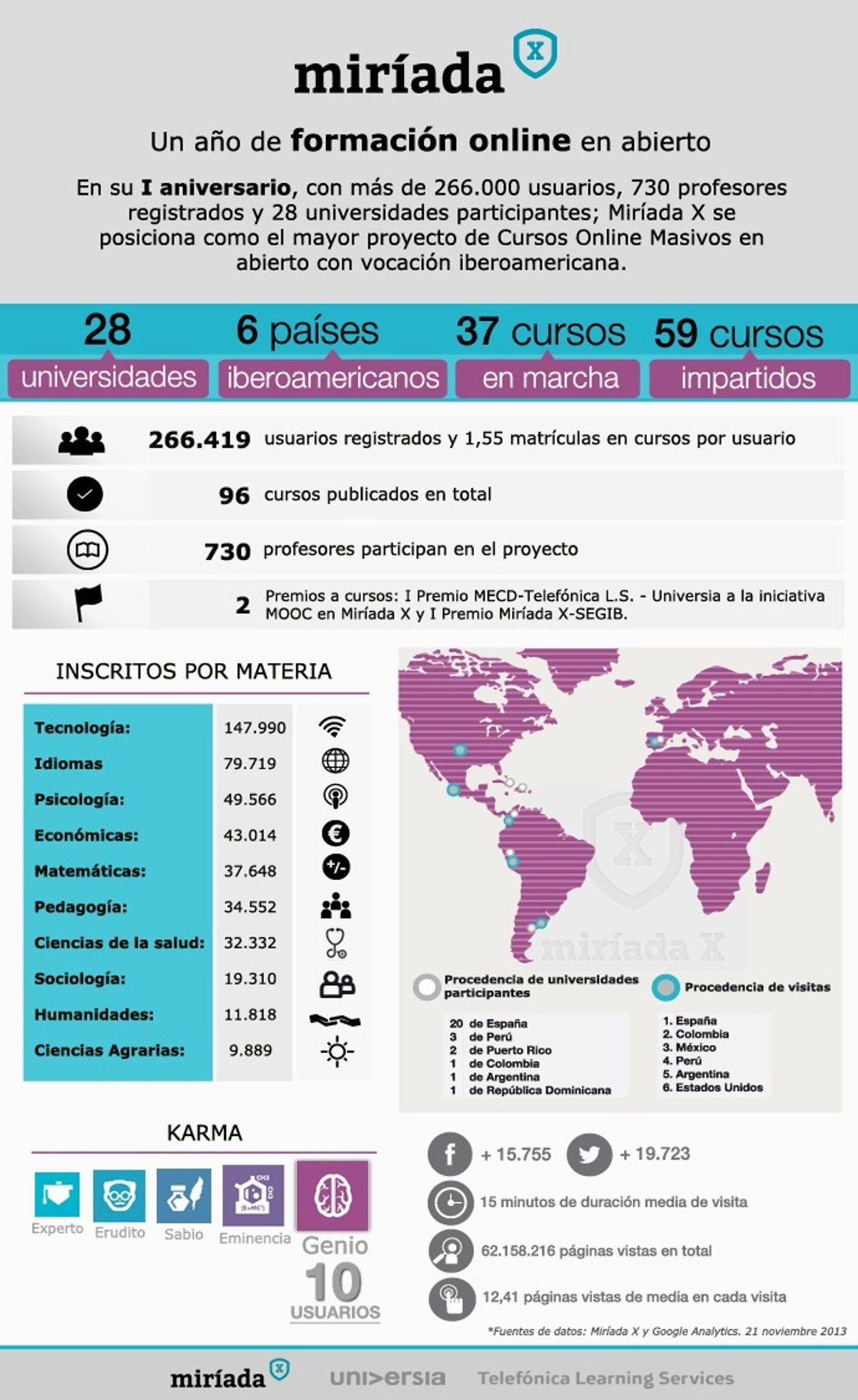 La plataforma integrada en Universia --red de universidades perteneciente al Banco Santander-- 'Miriada X', cumple un año ofreciendo cursos online totalmente gratuitos e impartidos por los mejores profesores de universidades españolas y latinoamericanas, conocidos como MOOCs (Masive Online Open Courses).