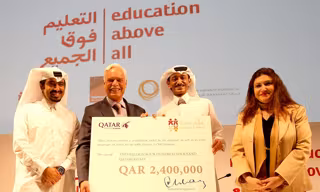 El vicepresidente Sénior de Contratos y Adquisiciones de Qatar Airways, Mohsen Alyafei, ha hecho entrega del cheque a los representantes de Educate A Child en una ceremonia que ha tenido lugar en la cumbre World Innovation Summit for Education, en Doha.