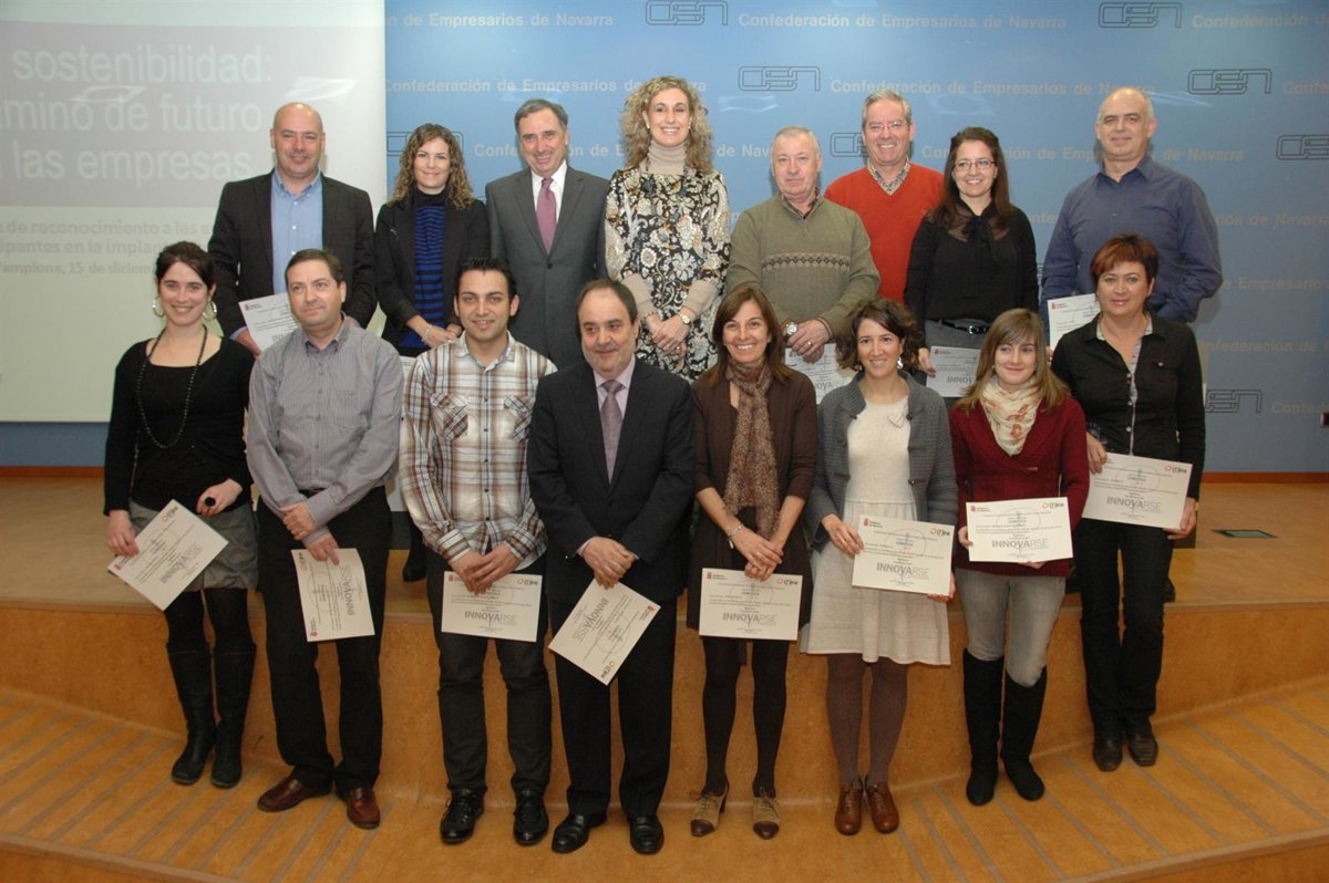 La directora general de Trabajo y Prevención de Riesgos Laborales del Gobierno de Navarra, Imelda Lorea, y José Antonio Sarría, presidente de la Confederación de Empresarios de Navarra (CEN), han hecho entrega este jueves de diplomas a una veintena de empresas navarras que durante 2011 han desarrollado memorias de sostenibilidad con la Metodología InnovaRSE.