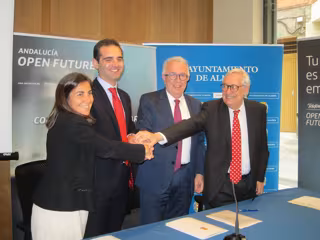El consejero de Empleo, Empresa y Comercio, José Sánchez Maldonado, y la directora de Telefónica en el Territorio Sur, María Jesús Almazor, han firmado este viernes en Almería junto al alcalde de la ciudad, Ramón Fernández-Pacheco (PP), la adhesión del Ayuntamiento al convenio marco suscrito por Junta de Andalucía y Telefónica para impulsar el emprendimiento basado en la innovación a través de la iniciativa Andalucía Open Future, de forma que se ha presentado el nuevo espacio de emprendimiento 'El Cable', que acogerá los primeros ocho proyectos a mediados de junio.