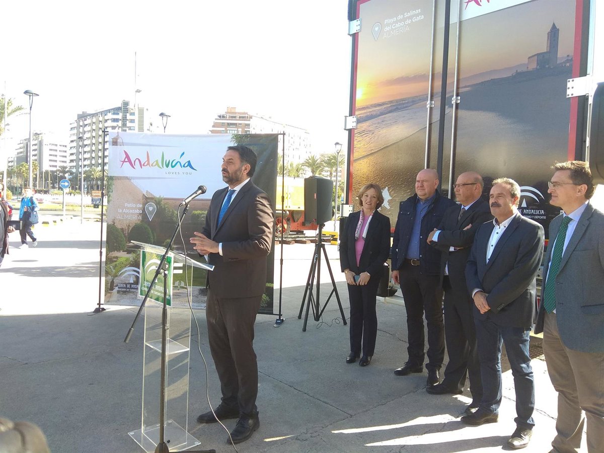 El consejero de Turismo y Deporte de la Junta de Andalucía, Francisco Javier Fernández, ha presentado este lunes las imágenes turísticas de Almería que un total de 33 camiones de las empresas Transcerezuela y Frío Ejido llevarán hasta el próximo verano en la parte trasera de su caja para promocionar el destino en los países europeos por los que transitan en sus exportaciones.