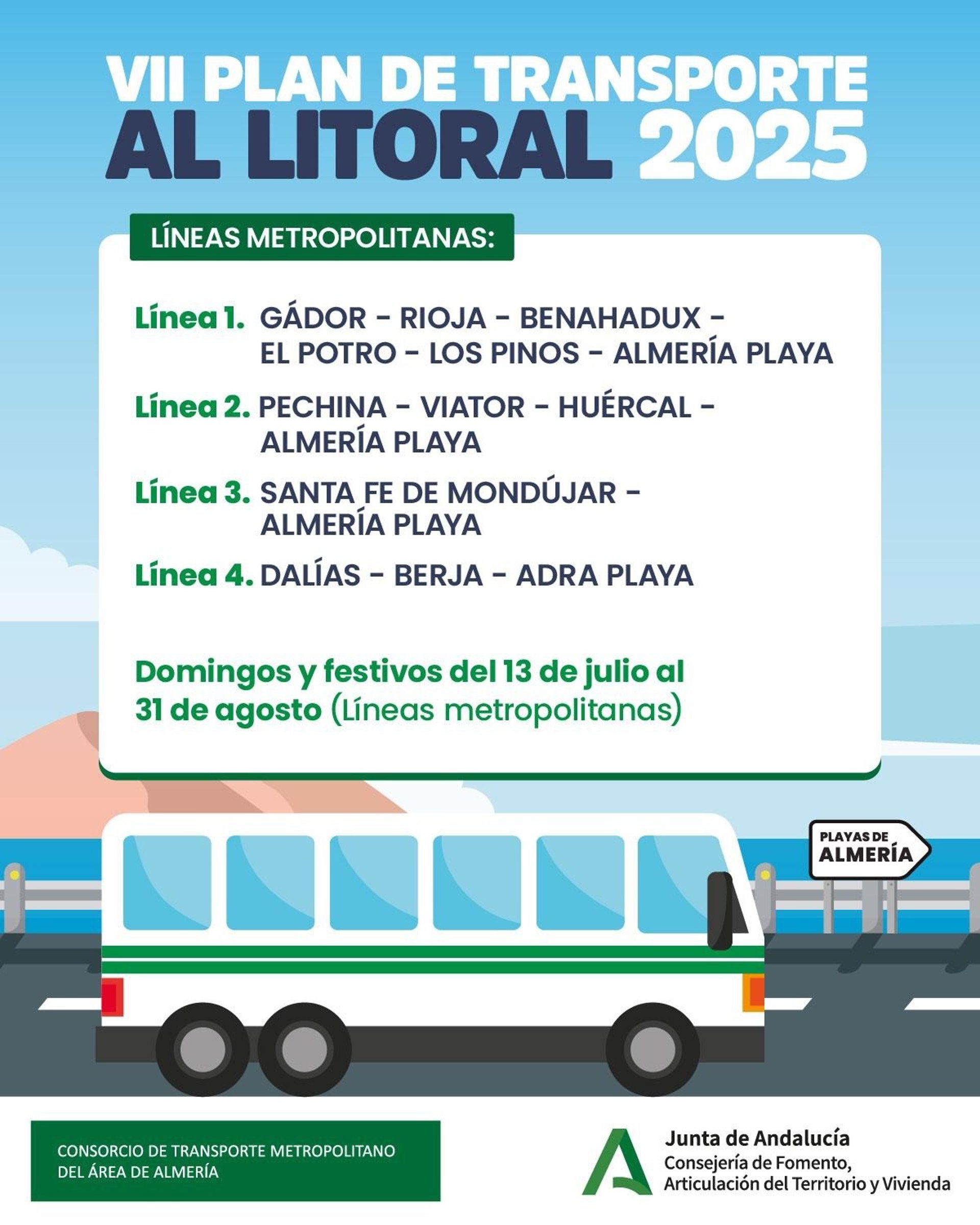 La Consejería de Fomento, Articulación del Territorio y Vivienda, a través del Consorcio de Transporte Metropolitano del Área de Almería, ha puesto en marcha durante los meses de julio y agosto rutas que conectarán por transporte público pequeños municipios del interior con las playas de Almería y Adra para "así luchar contra su aislamiento en los meses de verano".
