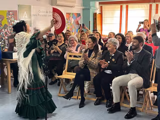 Asistentes a la celebración del reconocimiento con la Bandera de Andalucía al centro ocupacional Javier Peña en Almería disfrutan de una actuación flamenca durante la jornada de convivencia. - JUNTA DE ANDALUCÍA