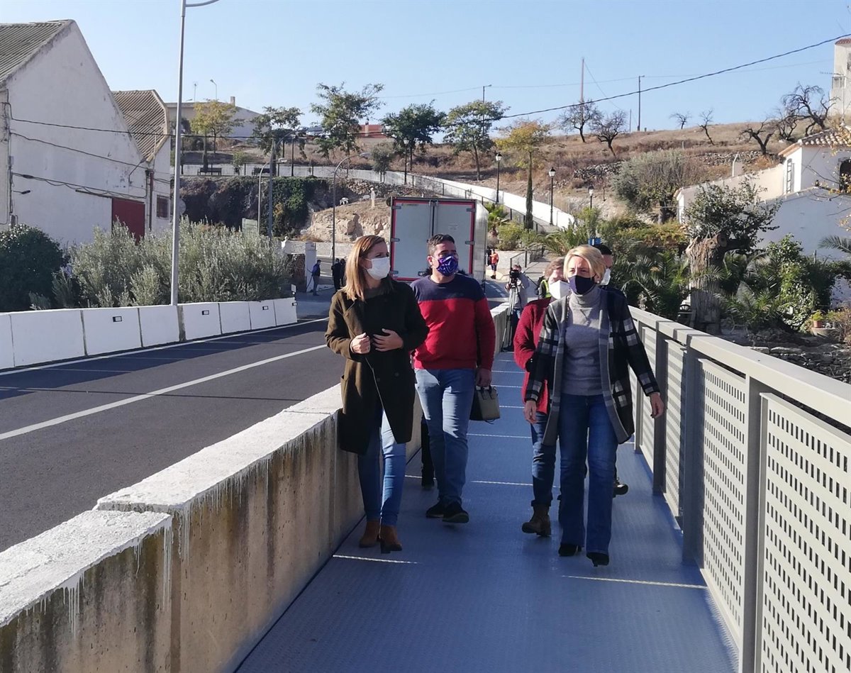 La delegada de la Junta de Andalucía en Almería, Maribel Sánchez Torregrosa, junto a la delegada territorial de Fomento, Infraestructuras, Ordenación del Territorio, Cultura y Patrimonio Histórico, Eloísa Cabrera, ha inaugurado este viernes la pasarela peatonal que la Junta ha construido, adosada al puente existente en la carretera A-110 a su paso por Uleila del Campo, en el que la Delegación de Fomento también ha realizado obras de refuerzo estructural.