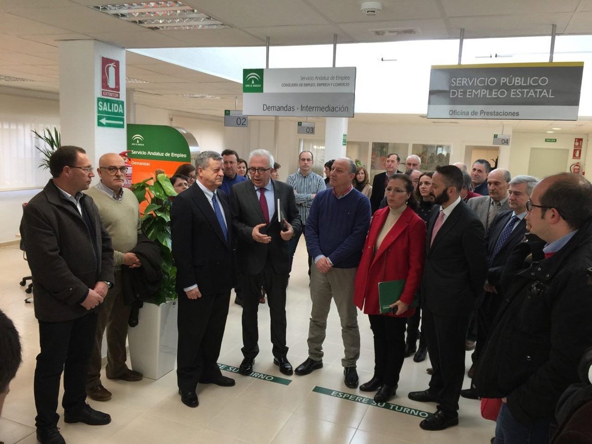 El consejero de Empleo, Empresa y Comercio de la Junta de Andalucía, José Sánchez Maldonado, ha inaugurado este viernes junto con el alcalde de Vélez-Rubio (Almería), Miguel Martínez-Carlón, la oficina de empleo del municipio tras una remodelación que ha supuesto una inversión de 85.000 euros para mejorar la atención al ciudadano e incrementar sus servicios.