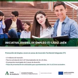 Esta Iniciativa Juvenil de Empleo ITI Cádiz e ITI Jaén permite a los ayuntamientos y entidades locales autónomas acceder a un incentivo de 8.880 euros por cada contrato que lleven a cabo por un período de seis meses a jornada completa, para los grupos de cotización del 4 al 10, en el marco de proyectos que podrán estar compuestos por diferentes obras o servicios.