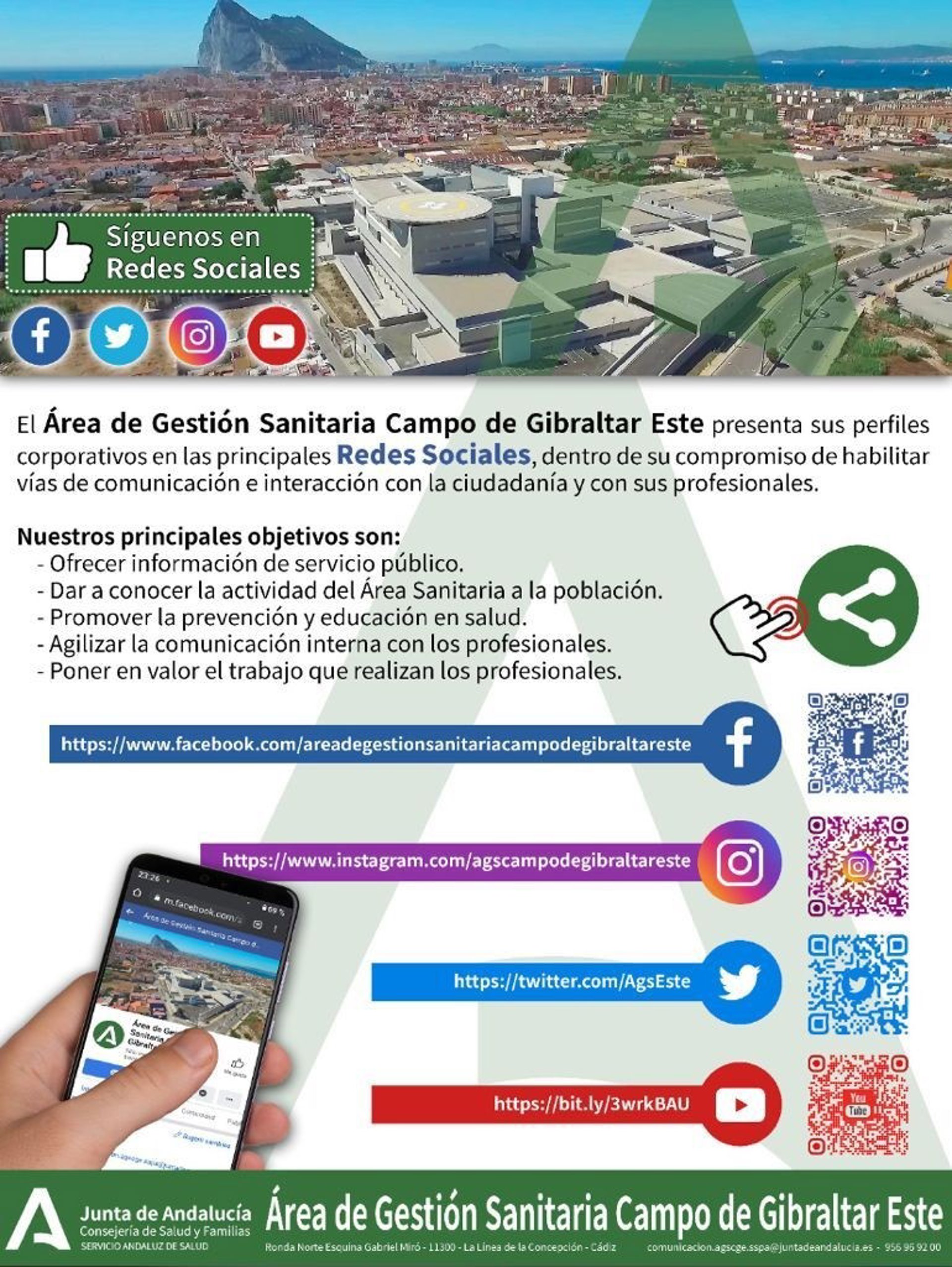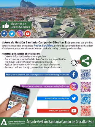 En Facebook, el perfil es areadegestionsanitariacampodegibraltareste; en Instagram, agscampodegibraltareste; en Twitter, @AgsEste; y en YouTube Área de Gestión Sanitaria Campo de Gibraltar Este.