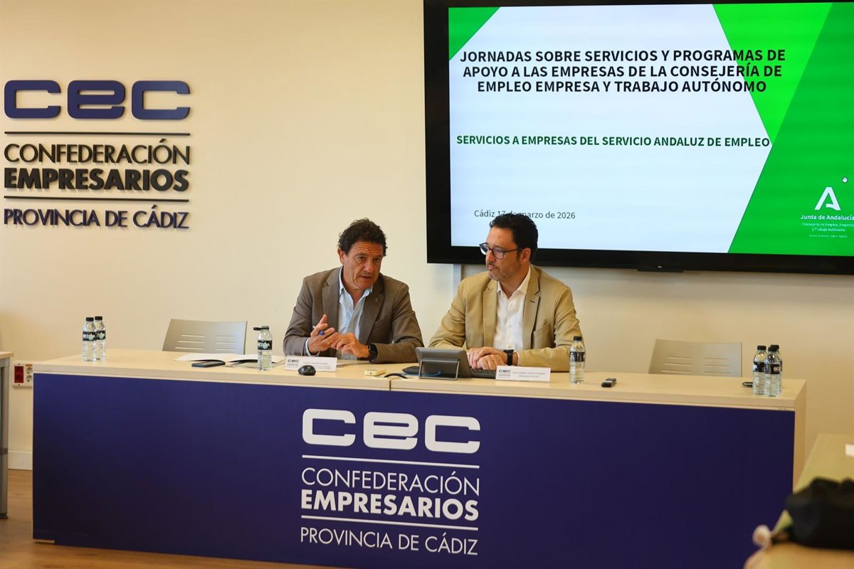 El delegado territorial de Empleo, Empresa y Trabajo Autónomo de la Junta de Andalucía en Cádiz, Daniel Sánchez Román, acompañado por el presidente de la Confederación de Empresas de la provincia de Cádiz (CEC), José Andrés Santos Cordero, ha inaugurado este martes una jornada informativa sobre servicios y programas de apoyo a las empresas de la Consejería de Empleo, Empresa y Trabajo Autónomo.