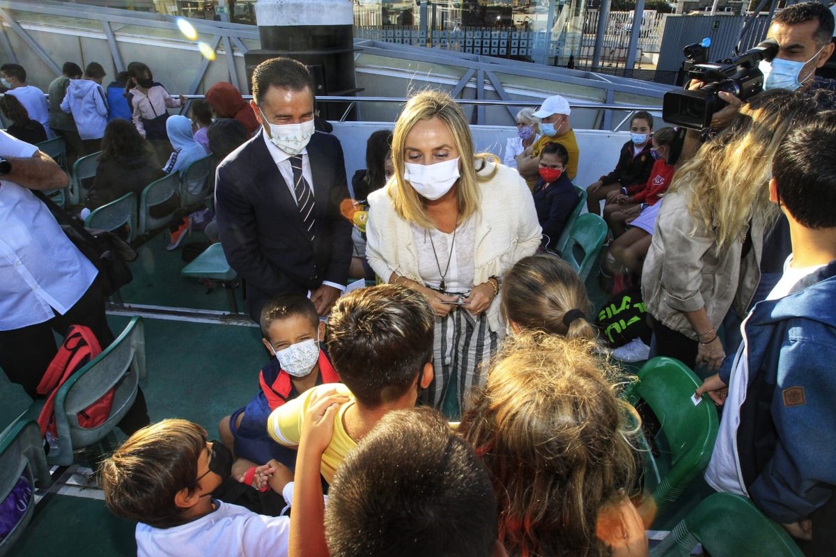 La consejera ha saludado a los escolares que desde la central de la Terminal Marítima de Cádiz han partido hacia El Puerto de Santa María realizando la actividad Aula Consorcio que organiza el ente metropolitano de transportes.
