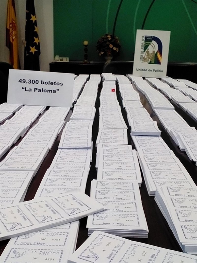 La Unidad de Policía adscrita a la Junta ha intervenido el 30 de abril en Barbate (Cádiz) un total de 49.300 boletos de lotería ilegal de 'La Paloma', organización no autorizada por la Junta de Andalucía para la celebración, organización y distribución de un sorteo paralelo al de la ONCE y uno de los "principales distribuidores" de esos billetes en la provincia.