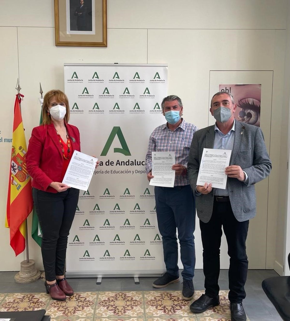 El delegado territorial de Educación y Deporte de la Junta de Andalucía en Cádiz, Miguel Andréu, la delegada territorial de Igualdad, Políticas Sociales y Conciliación, Ana Fidalgo, y el alcalde del Ayuntamiento de San Martín del Tesorillo, Jesús Fernández, han firmado el primer convenio para la prevención, seguimiento y control del absentismo escolar.