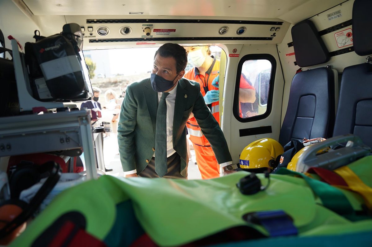 El presidente de la Junta de Andalucía, Juanma Moreno, ha presentado en el Hospital Universitario de Jerez (Cádiz) el nuevo helicóptero medicalizado que a partir de ahora prestará servicio y estará disponible los 365 días al año en la provincia gaditana. Se trata de una demanda de los vecinos desde hace años y es que "en la base de Jerez, que presta servicio a La Janda y la Sierra, sólo funcionaba desde el año 2013 un helicóptero cuatro meses y medio al año, concretamente desde mayo a mediados de septiembre", ha explicado.