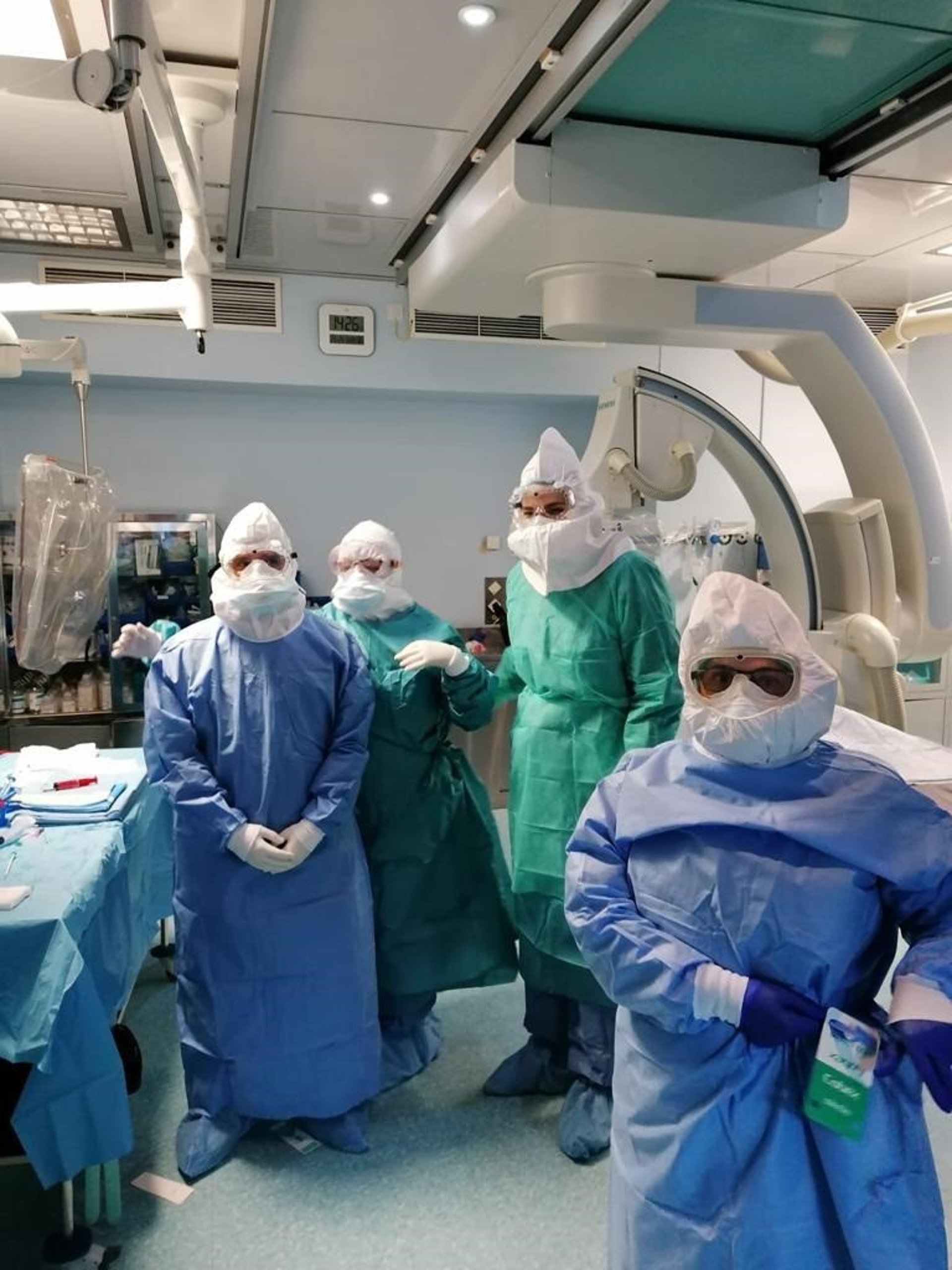 Para ello, se procedió al desalojo del material de la sala donde se iba a realizar el procedimiento, dejando tan solo lo necesario. Asimismo, los profesionales emplearon los pertinentes Equipos de Protección Individual como son --además del mandil de plomo que se usa en colocación de stents--, dos batas de quirófano estériles, una mascarilla FFP2, unas gafas protectoras, una escafandra de papel protectora, unas calzas altas y doble guante estéril.