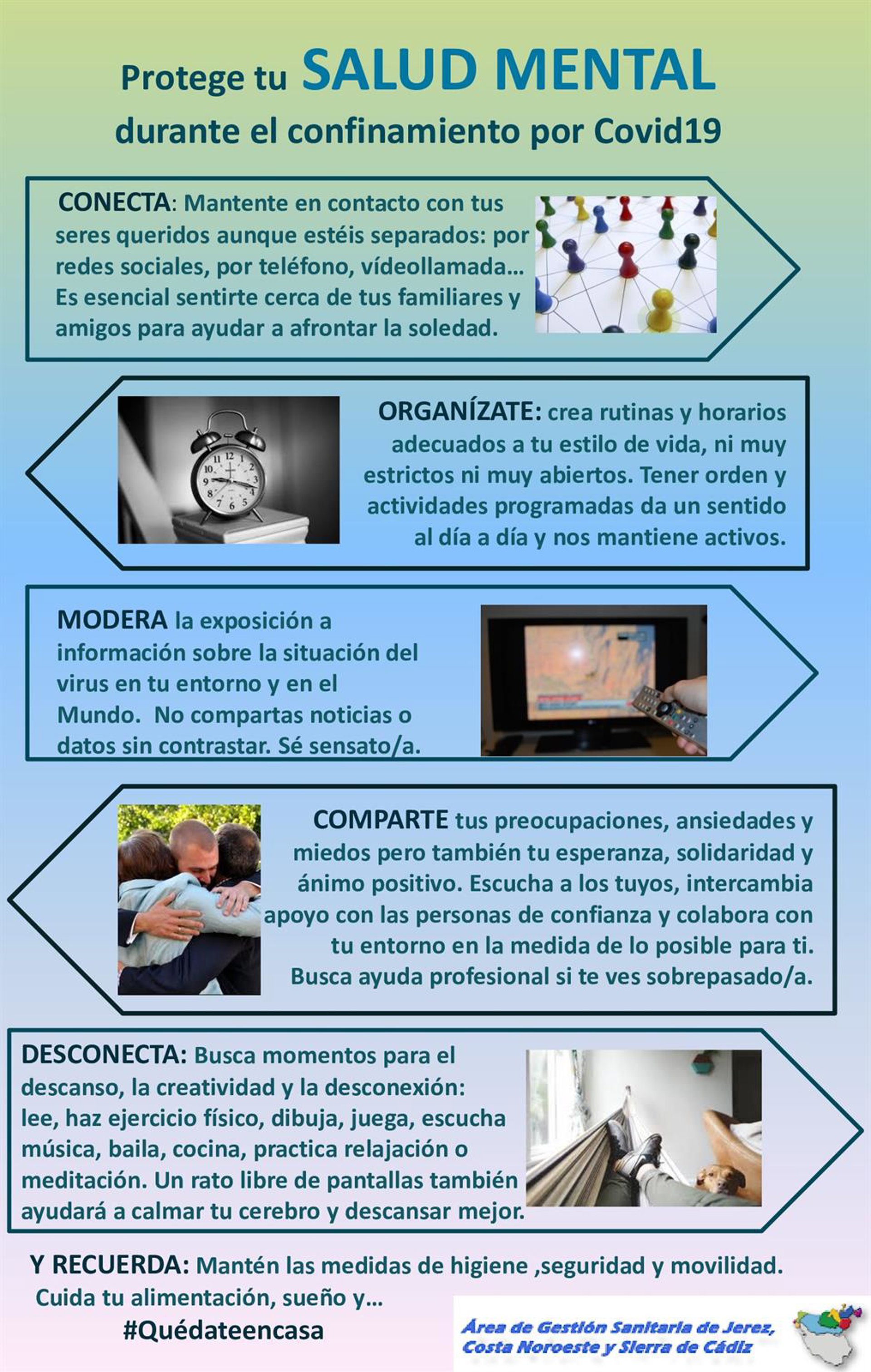 La Unidad de Salud Mental del Área de Gestión Sanitaria de Jerez, Costa Noroeste y Sierra, perteneciente a la Consejería de Salud y Familias, ha elaborado una serie de infografías con recomendaciones psicológicas para el confinamiento motivado por la pandemia del Covid-19 y destinada a personal sanitario, la población general y los menores.