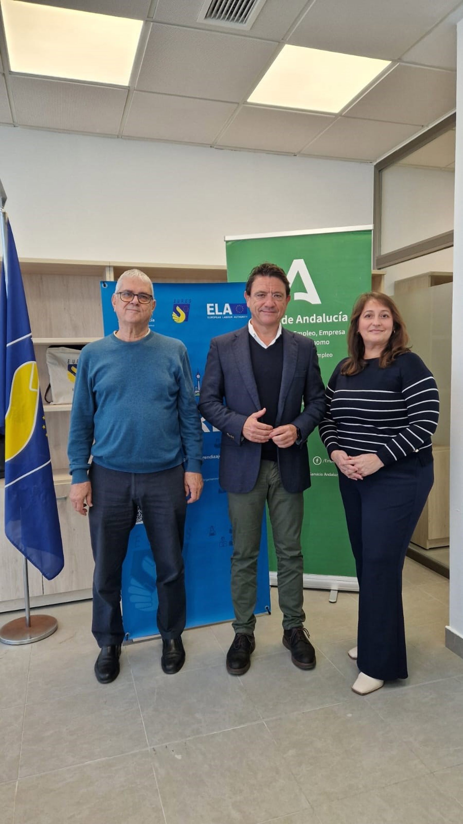 El delegado de Empleo, Daniel Sánchez, con el responsable de Eures en Cádiz saliente por jubilación, Alfonso Calzada, y quien asume la responsabilidad desde febrero, Asunción Ruiz. - JUNTA DE ANDALUCÍA