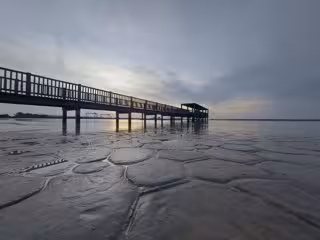 La imagen ganadora plasma una vista del puente de madera sobre el río San Pedro con la perspectiva de la zona industrial de la Bahía al fondo, en una original composición que combina el horizonte con la geometría del suelo y las grúas del astillero enmarcadas en los arcos del embarcadero, según destacó el jurado que la eligió finalista, según ha explicado la Junta en una nota de prensa.