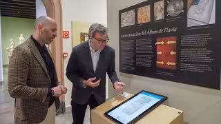 Eduardo Lucena (izda.) contempla la exposición sobre la restauración del Album de Flavia, en el Bellas Artes de Córdoba. - JUNTA DE ANDALUCÍA