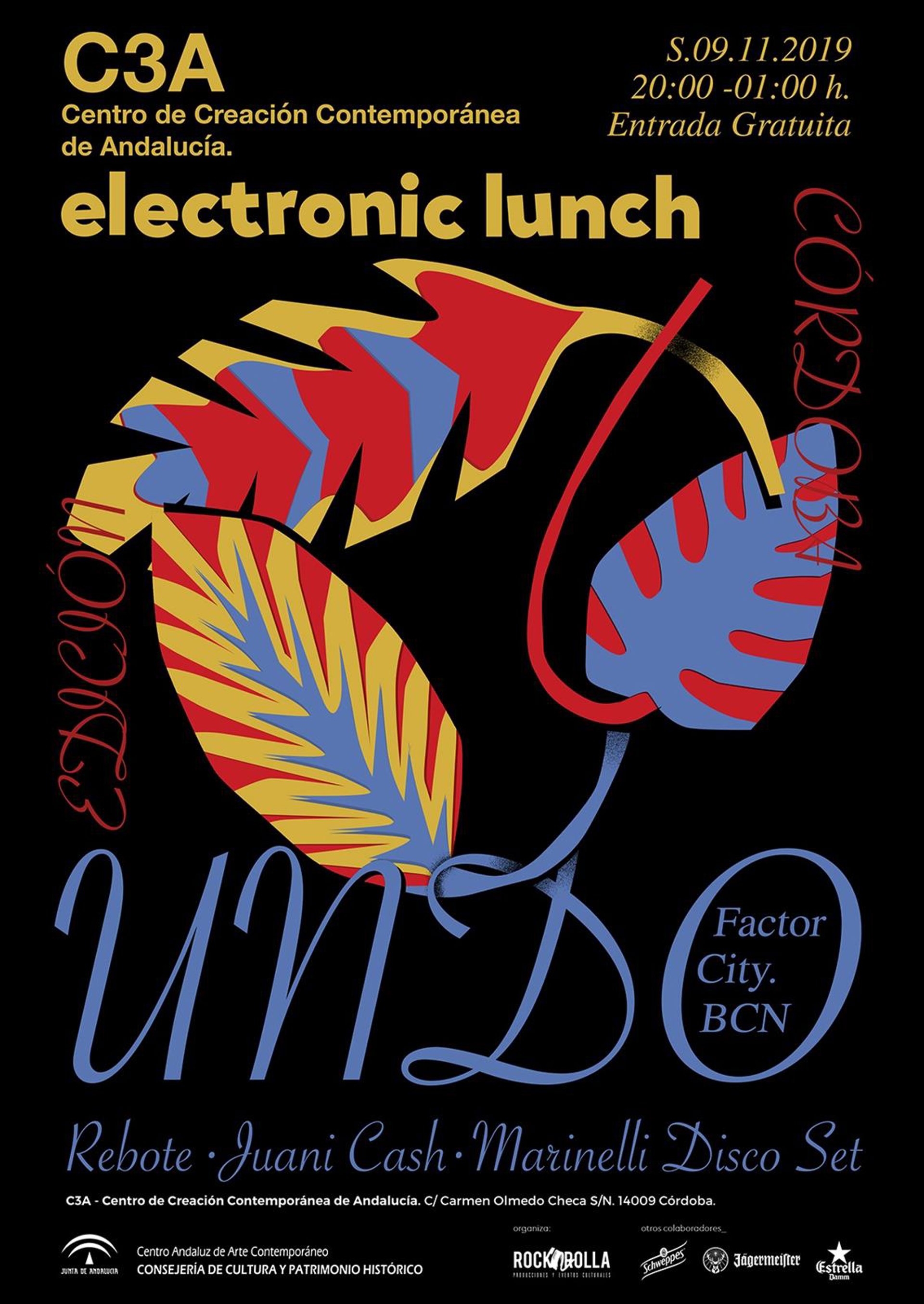 'Electronic Lunch', tras varias exitosas ediciones en el Centro Andaluz de Arte Contemporáneo (CAAC), se celebra en esta ocasión en un espacio tan singular como lo es el Centro de Creación Contemporánea de Andalucía (C3A) de Córdoba. Esta edición cuenta con la presencia de 'Undo (Factor City, BCN)', junto a las sesiones de 'Juani Cash (Jukebox Jam)', 'Marinelli Disco Set' y 'Rebote'.